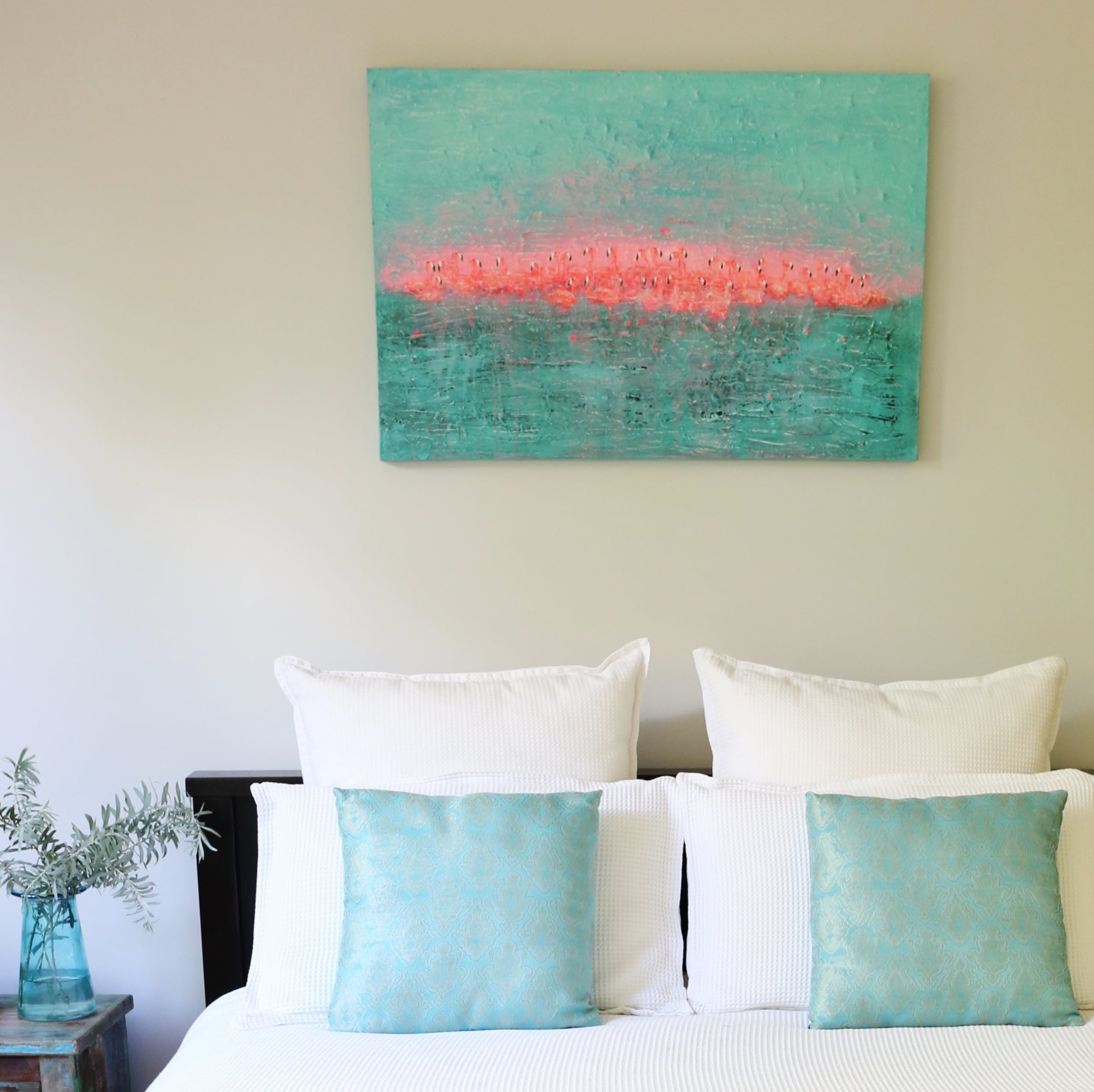 ‘Flamingos’ a highly textured original abstract painting on canvas in bright aqua and neon pink hues. Perfect for a bedroom, guest room or living area.