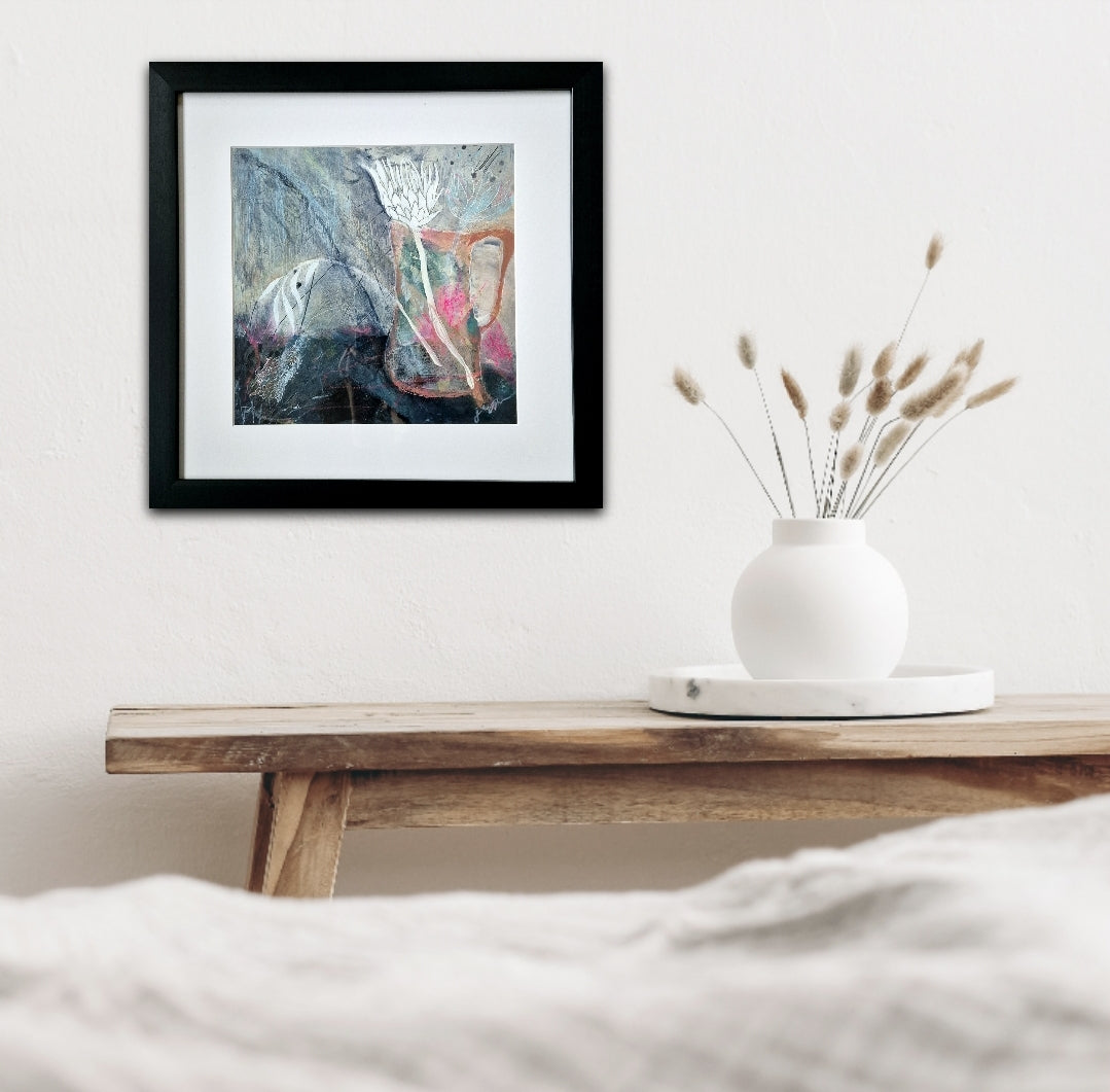 “Jug of Flowers” Modern abstract floral mixed media artwork, painted on heavyweight watercolour paper using acrylic polymer, ink, oil stick, collage, and some found charcoal. Professionally framed including custom cut acid-free mountboard, ready to hang on the wall.