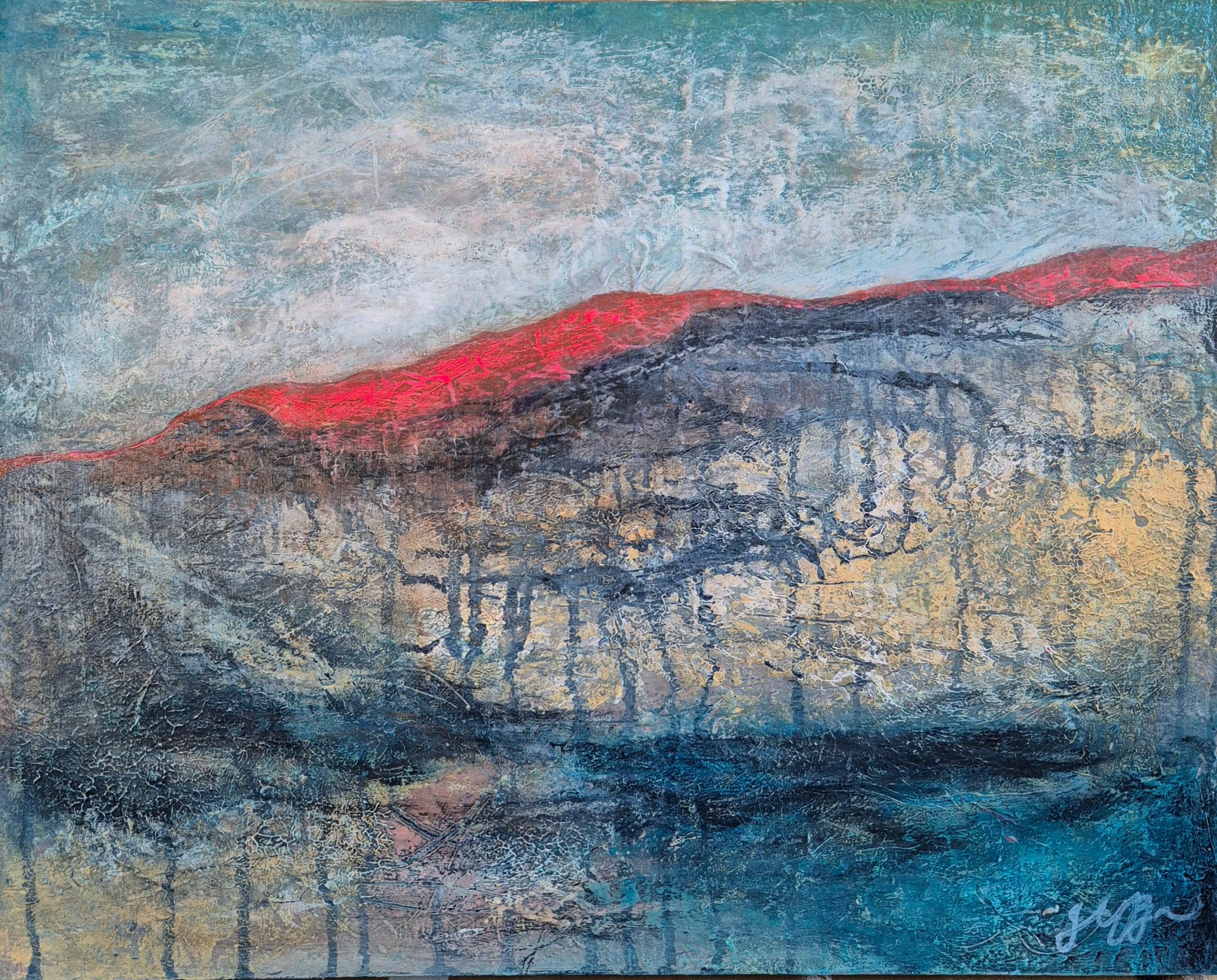 I made this painting on a reclaimed canvas that I found during a bit of a studio tidy. Painted using acrylics, charcoal and pigment ink.  Many layers create a deep, rich texture, and the piuece has been finished with a brush on satin varnish, to give it a nice sheen.  The gallery wrapped edges have been painted around, so there is no need to add an external frame to the work,  unless desired.