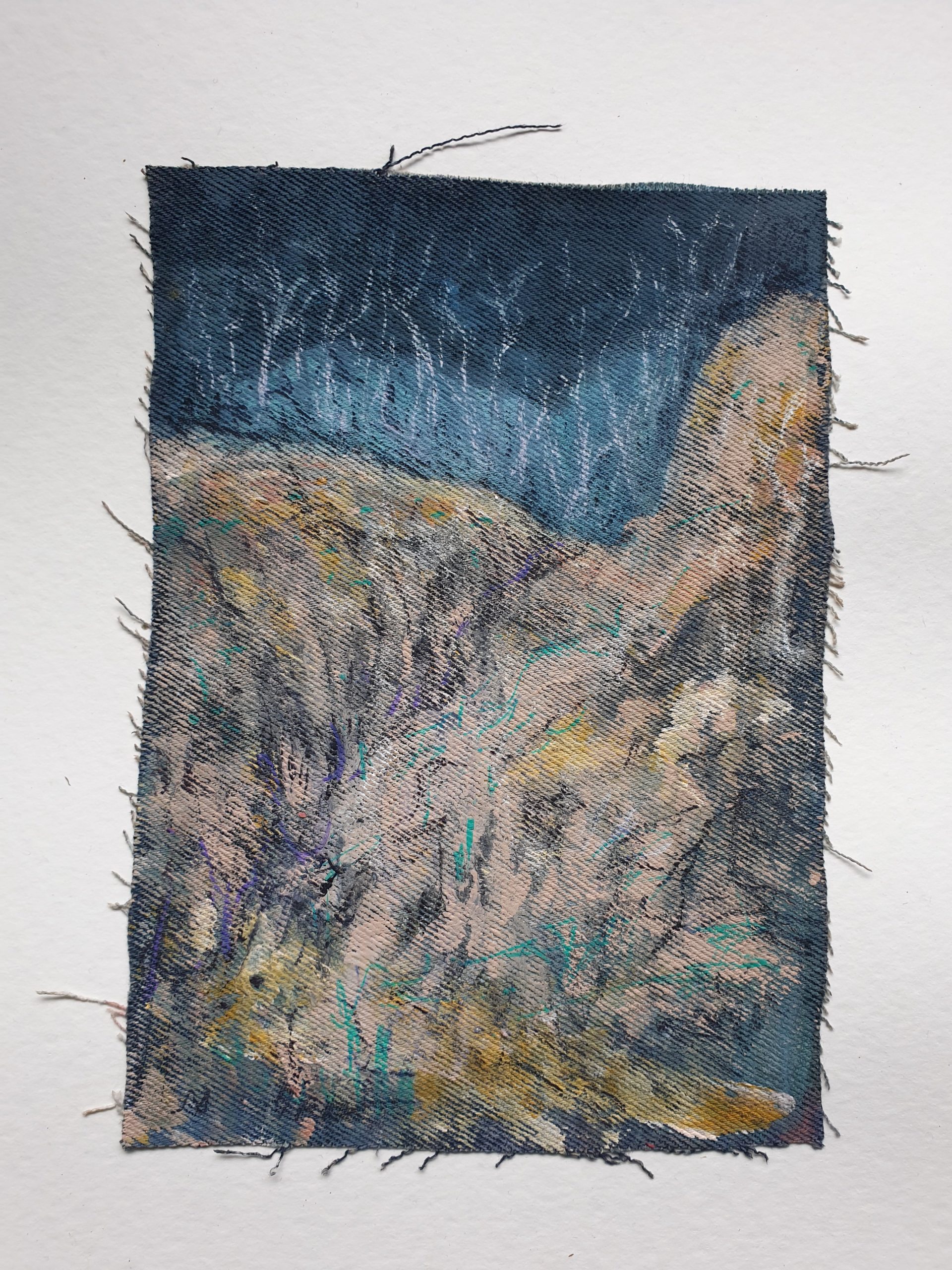 The painting has been made on a piece of reclaimed denim, using artist quality acrylic paint, pastels, charcoal and pigment ink.