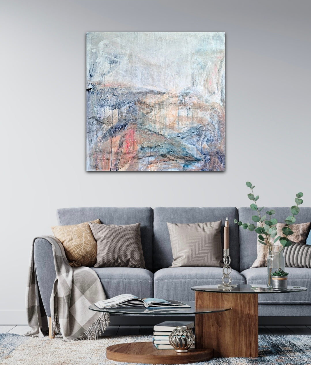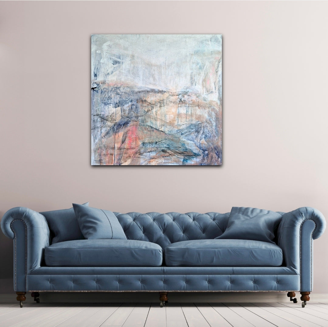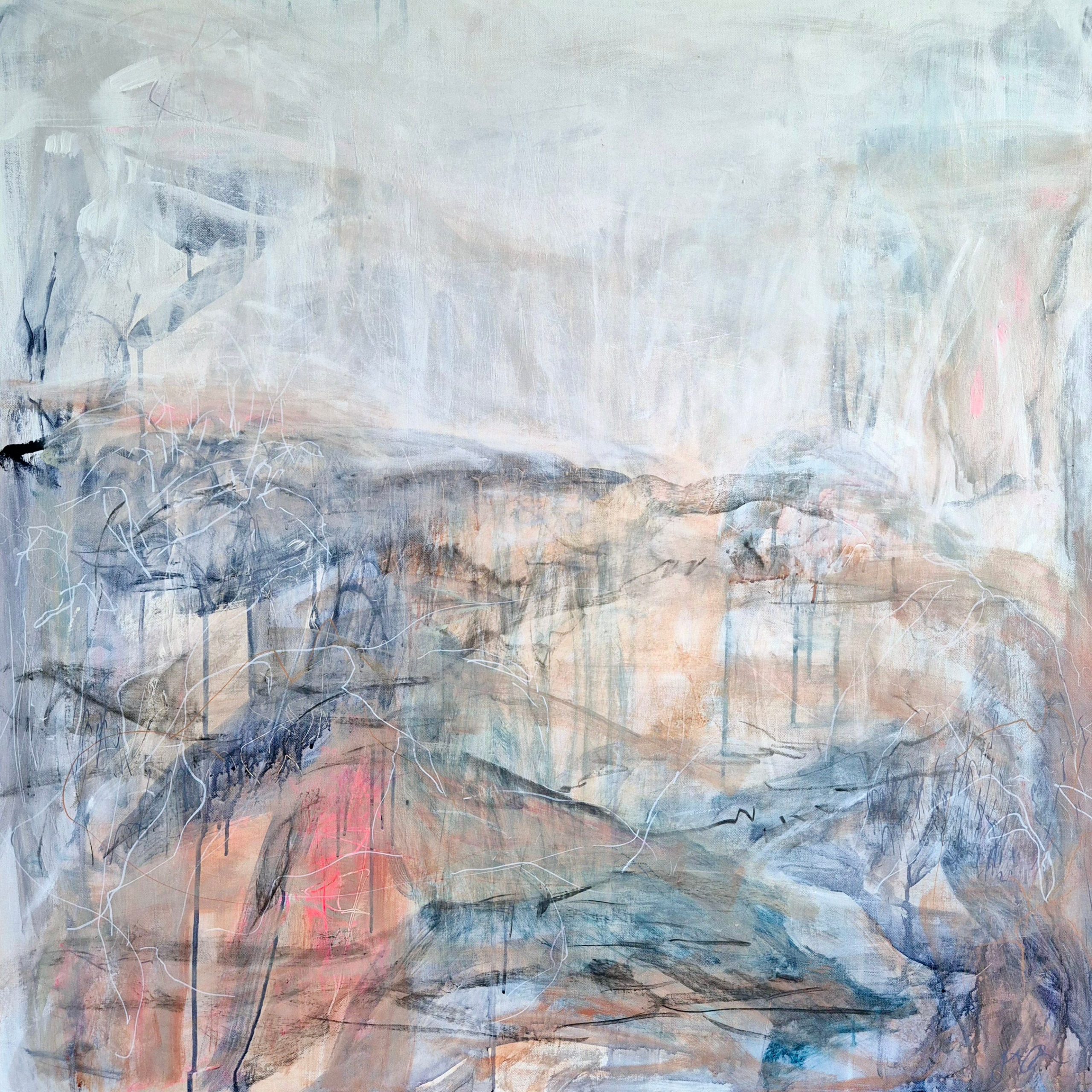 Original abstract landscape painting – mixed media – acrylic, ink and charcoal on stretched canvas, 91 x 91cm.